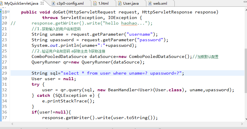SQL语句拼错了,正确的是“select * from user where uname = ? and upassword = ?”。另外,请读者查看程序中是否给“?”赋值了?